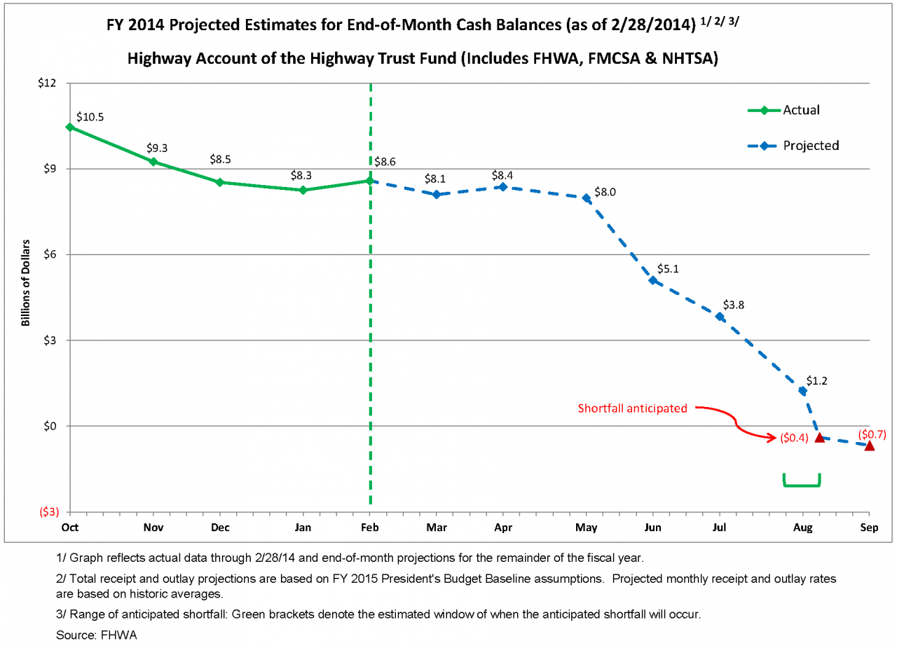 Based on current spending and revenue trends, the U.S. Department of Transportation estimates that the Highway Account of the Highway Trust Fund will encounter a shortfall before the end of fiscal year (FY) 2014. See USDOT HTF Ticker for more details.